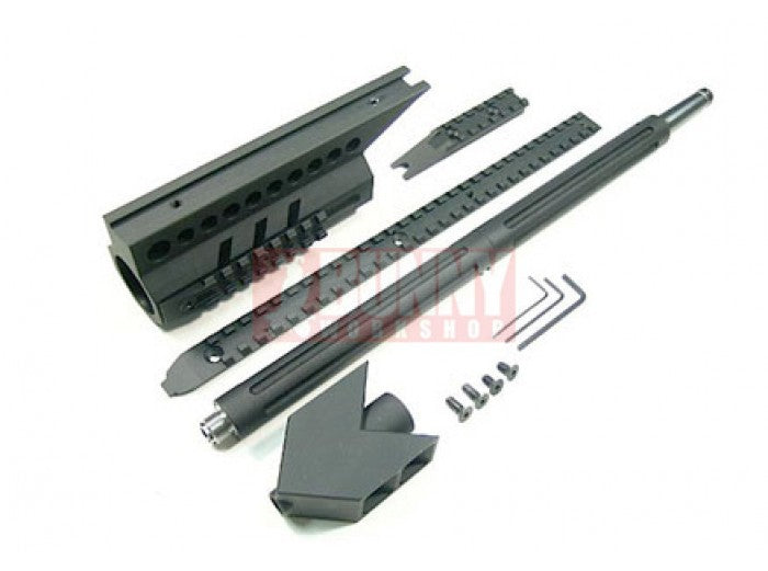 Package with Upper rail x 1, Lower Rail x1 & Side Rails x 2, Outer Barrel, 14mm(-) Adapter, Barrel Cover, M82 Style Flash Hider (All Hexangular Screws included)