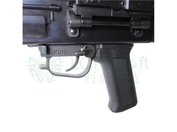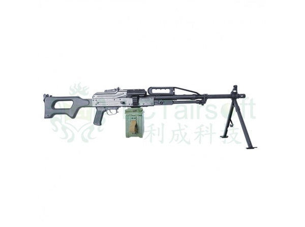 The PKP Pecheneg is a standard 7.62×54mmR PKM machine gun without the rapid barrel-change option, and intended for use from an integral bipod as a squad support weapon. It can provide more sustained firepower than the standard-issue RPK-74, and the 7.62×54mmR cartridge offers a longer effective range and better penetration of light structures and improvised covers in urban and forest environments.
