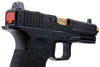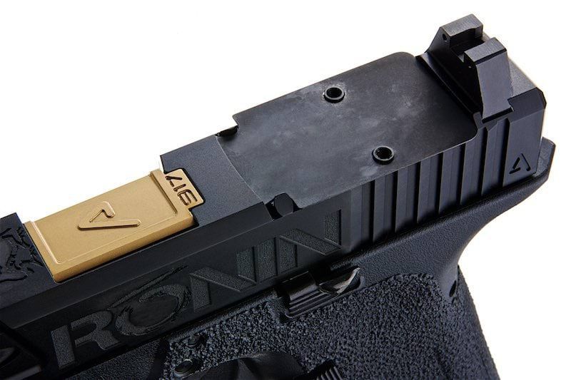 The RWA Agency Arms Ronin Pistol is based on the tried and true EXA Pistol with a few upgrades. Most notably the pistol is modeled after the very first collaborative pistol between Agency Arms and Tu Lam from Ronin Tactics! This pistol features a CNC aluminum slide and a CNC stainless steel outer barrel with a PVD finish. The Ronin Pistol features the signature Dragon Scale Front Serrations, an RMR cut with Bonesaw cut battle plate, Ronin Tactics' signature red slide plate, and steel suppressor sights. The outer barrel is a 14mm CCW threaded barrel that is based on the Agency's Premier Line barrel and comes with an Agency-style thread protector. The Ronin Tactics Logos are engraved on the slide, barrel, and slide plate.