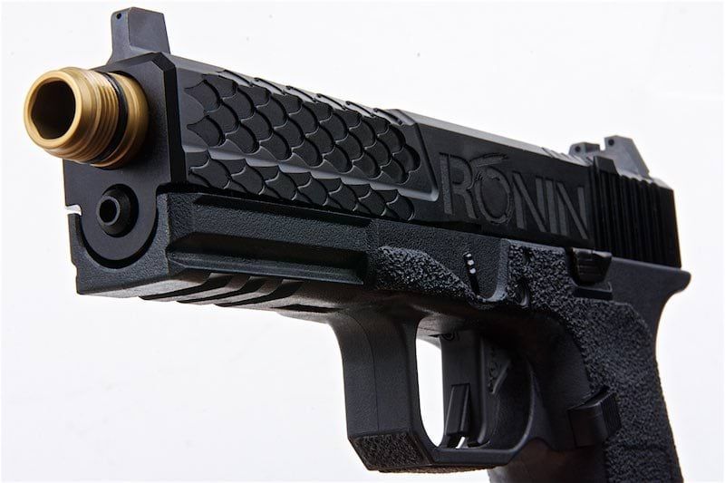 The Ronin Pistol comes with a stainless steel outer barrel with a PVD coating to simulate the real pistol's gold finish. The threading on this outer barrel is 14mm CCW, allowing users to install whatever preferred mock suppressors/tracer units. We have included an o-ring on the threaded barrel to ensure any accessories attached to the outer barrel will be snug and secure.