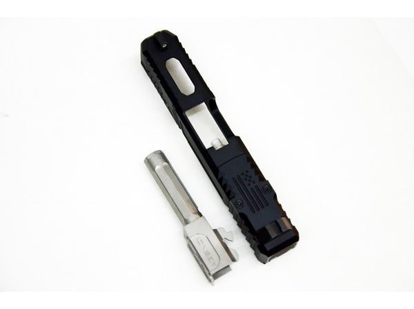 Package Includes- Aluminum Slide, Steel Outer Barrel, Recoil Spring and Spring Guide Rod, Steel Front and Rear Sight, Full Nozzle Set, and Zero Nozzle Housing Set, Inner Barrel Stabilizer, RMR Cover, Hammer, Bearing and Sping Set